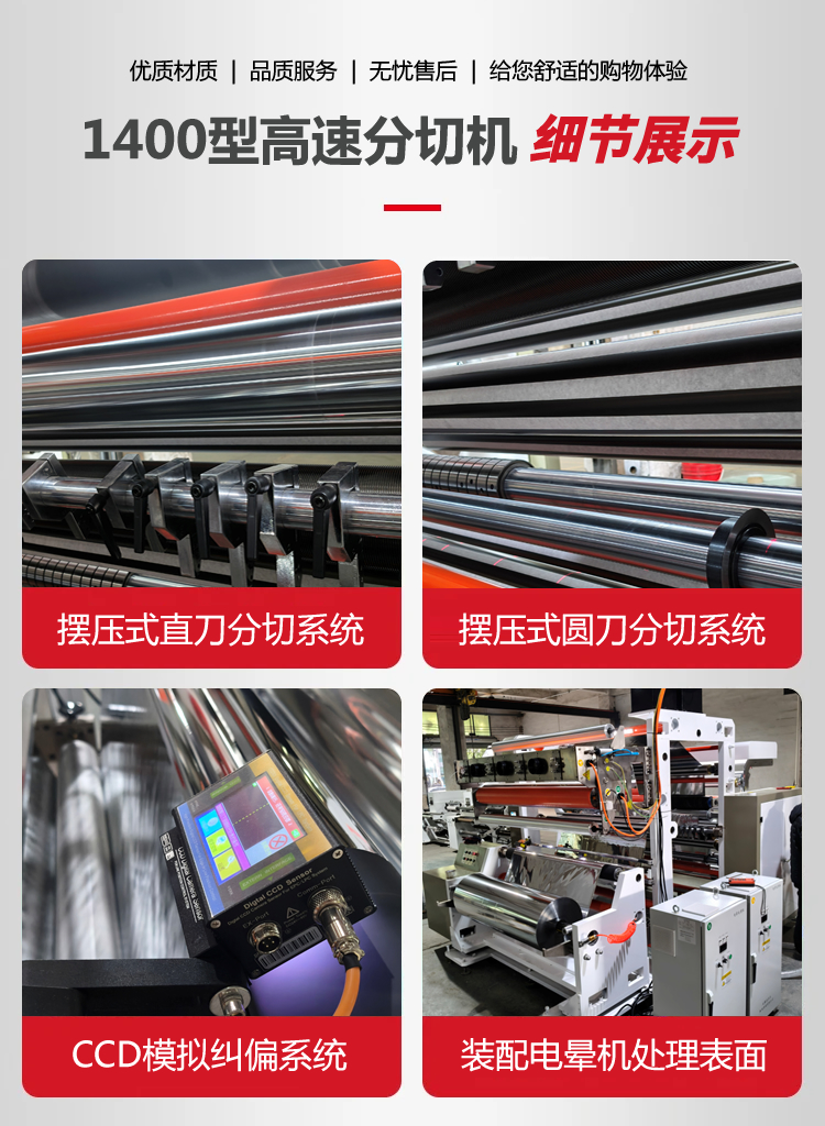为福建客户定制的1400D4-2型电脑控制高速分切机,宽幅1400mm,分切速度350m/min,采用CCD模拟纠偏系统,配备摆压式直刀和圆刀分切系统,分切多种规格,按要求配置电晕机,速度150m/min。分切12u-50um卷筒类镭射膜、镀铝膜、冷烫膜、电化品等塑料薄膜